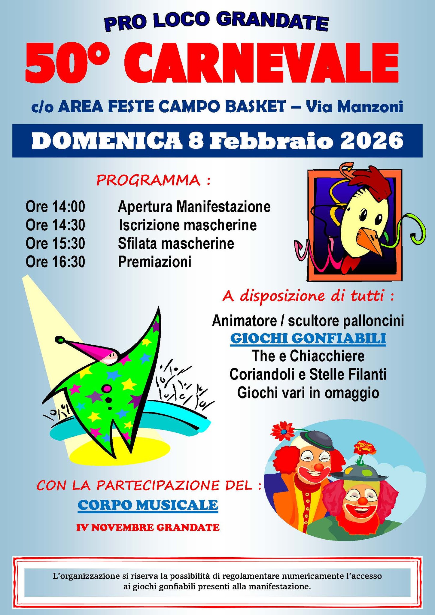 DOMENICA 8 Febbraio 2026 c/o AREA FESTE CAMPO BASKET – Via Manzoni, PRO LOCO GRANDATE organizza il 50° CARNEVALEPROGRAMMA:Ore 14:00 Apertura ManifestazioneOre 14:30 Iscrizione mascherineOre 15:30 Sfilata mascherineOre 16:30 PremiazioniA…